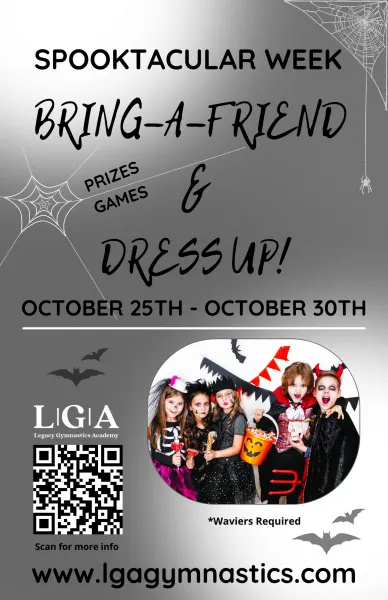 Legacy Gymnastics and Parkour San Diego kicks off the Holiday Season with our Spooktacular Week. In the interest of keeping things fun and creative, why not dress up in costume and bring your friend to class!? If you’re not enrolled yet, there is still time to participate in our Spooktacular Week of FUN! Sign up NOW at www.lgagymnastics.com.